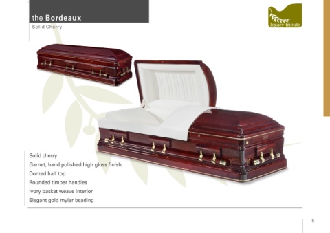 the Bordeaux Solid Cherry Solid cherry Garnet, hand polished high gloss finish Domed half top Rounded timber handles Ivory basket weave interior Elegant gold mylar beading 5