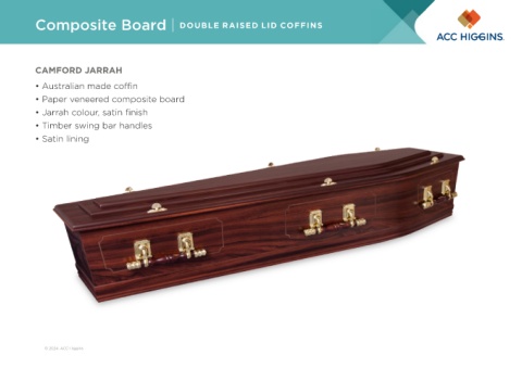Composite Board | DOUBLE RAISED LID COFFINS CAMFORD JARRAH • Australian made coffin • Paper veneered composite board • Jarrah colour, satin finish • Timber swing bar handles • Satin lining © 2024. ACC Higgins