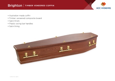 Brighton | TIMBER VENEERED COFFIN • Australian made coffin • Timber veneered composite board • Satin finish • Plastic swing bar handles • Satin lining © 2024. ACC Higgins