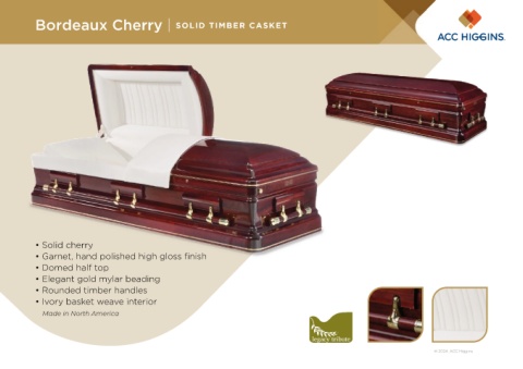 Bordeaux Cherry | SOLID TIMBER CASKET • Solid cherry • Garnet, hand polished high gloss finish • Domed half top • Elegant gold mylar beading • Rounded timber handles • Ivory basket weave interior Made in North America © 2024. ACC Higgins