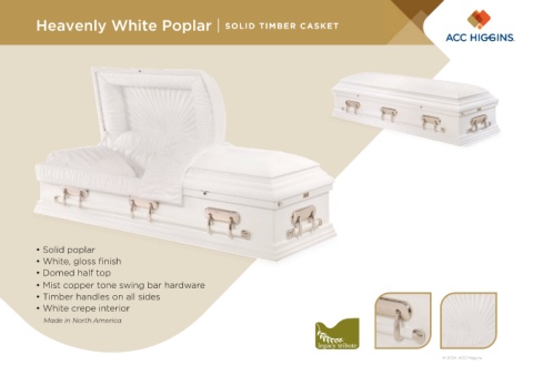 Heavenly White Poplar | SOLID TIMBER CASKET • Solid poplar • White, gloss finish • Domed half top • Mist copper tone swing bar hardware • Timber handles on all sides • White crepe interior Made in North America © 2024. ACC Higgins