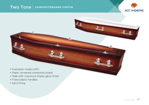 Two Tone | COMPOSITEBOARD COFFIN • Australian made coffin • Paper veneered composite board • Teak with rosewood shade, gloss finish • Fixed plastic handles • Satin lining © 2022. ACC Higgins 67