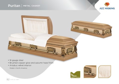 Puritan | METAL CASKET • 16 gauge steel • Brushed copper glow and autumn haze finish • Artubus velvet interior Made in North America 82 © 2022. ACC Higgins