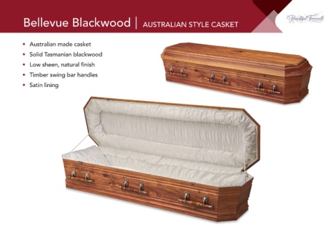 Bellevue Blackwood AUSTRALIAN STYLE CASKET • Australian made casket • Solid Tasmanian blackwood • Low sheen, natural finish • Timber swing bar handles • Satin lining •