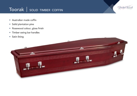 Toorak SOLID TIMBER COFFIN • Australian made coffin • Solid plantation pine • Rosewood colour, gloss finish • Timber swing bar handles • Satin lining