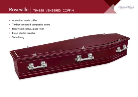 Roseville TIMBER VENEERED COFFIN • Australian made coffin • Timber veneered composite board • Rosewood colour, gloss finish • Fixed plastic handles • Satin lining