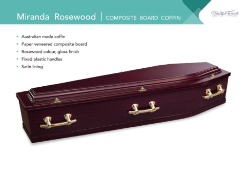 Miranda Rosewood COMPOSITE BOARD COFFIN • Australian made coffin • Paper veneered composite board • Rosewood colour, gloss finish • Fixed plastic handles • Satin lining