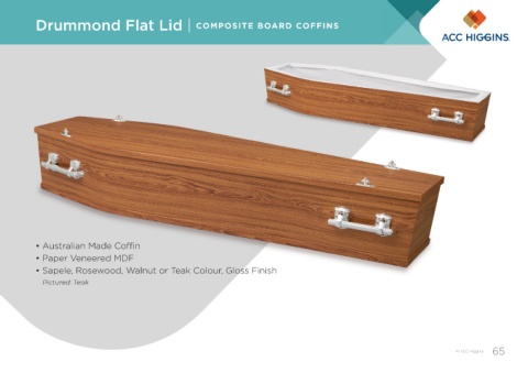 Drummond Flat Lid | COMPOSITE BOARD COFFINS • Australian Made Coffin • Paper Veneered MDF • Sapele, Rosewood, Walnut or Teak Colour, Gloss Finish Pictured: Teak © ACC Higgins 65